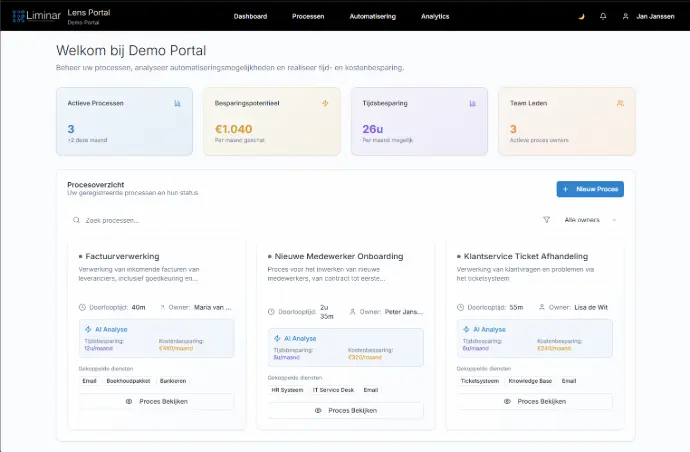 Voor organisaties die dagelijks tientallen processen uitvoeren en worstelen met inefficiëntie, is Liminar Process Lens het platform dat processen zichtbaar maakt, AI-advies geeft over automatisering en direct de koppeling legt naar echte automations.